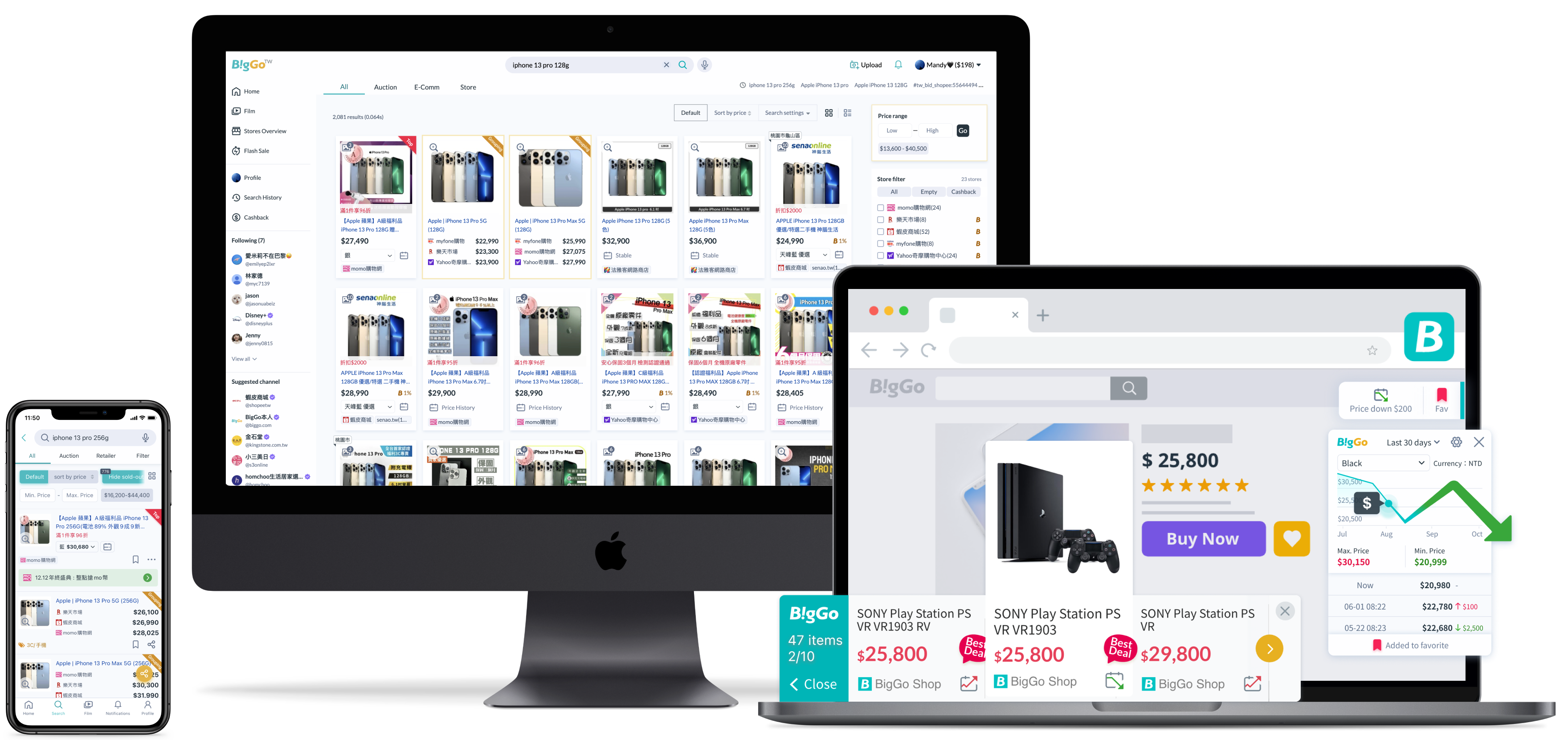 We aimed to provide the best all in one service for our users to enjoy shopping and saving money online. Starting from Taiwan, we keep improving and expanding our service to all around the world. Now BigGo is the biggest price comparison platform in Taiwan, Thailand and Malaysia.